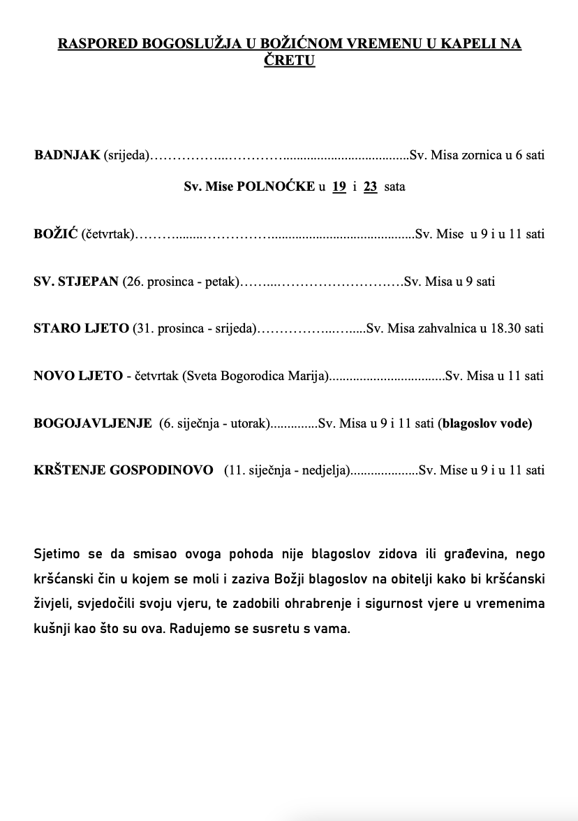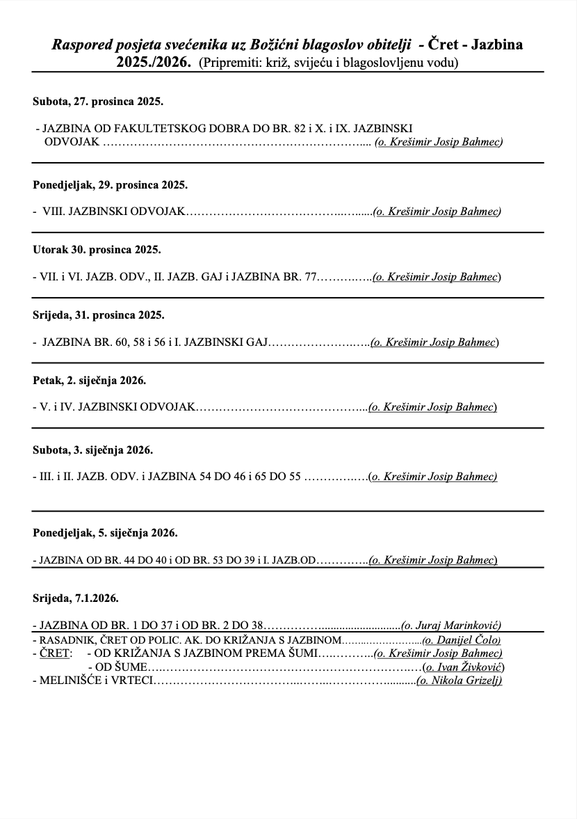 Raspored blagoslova obiteljskih domova Čret - Jazbina 2025./'26.