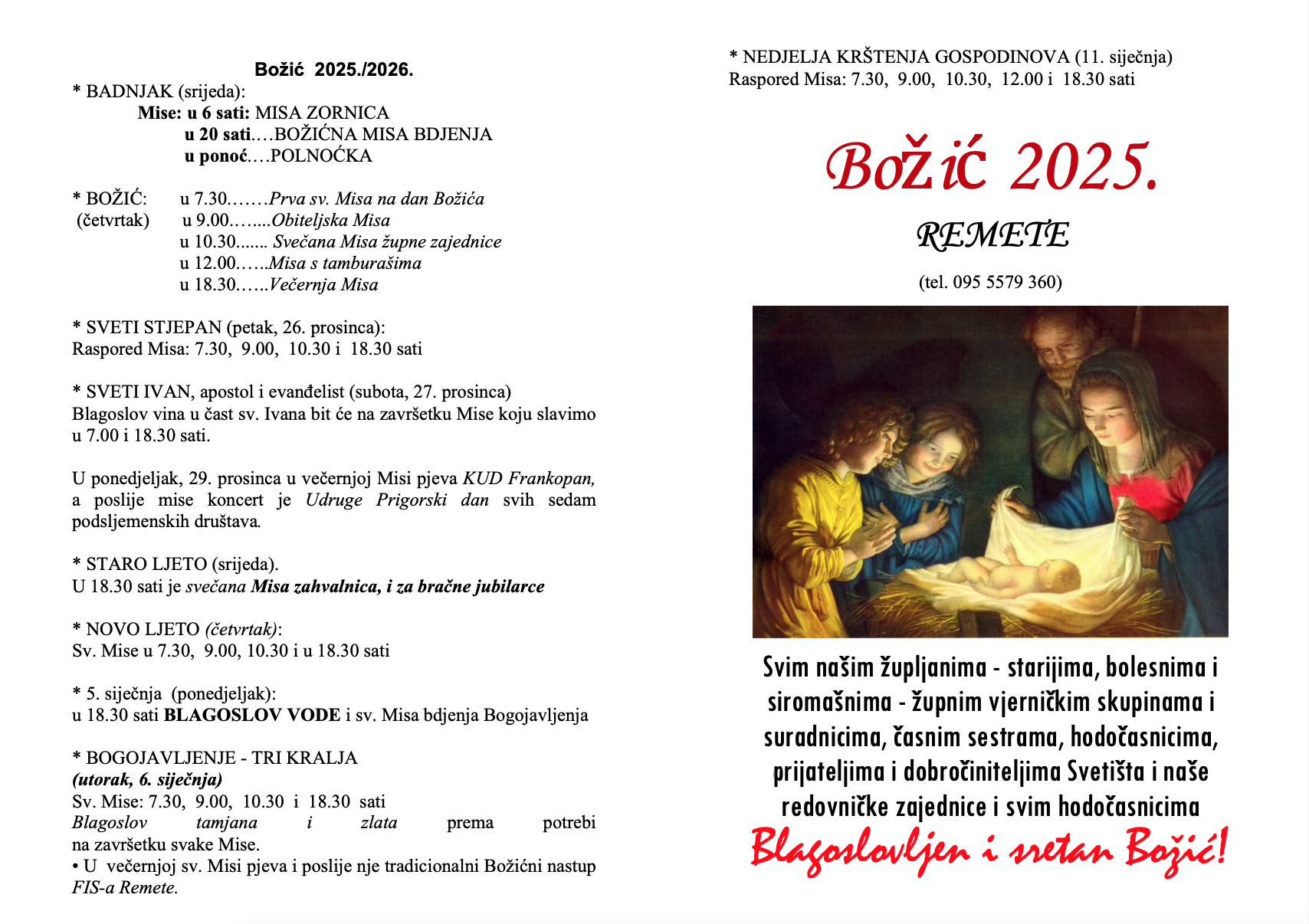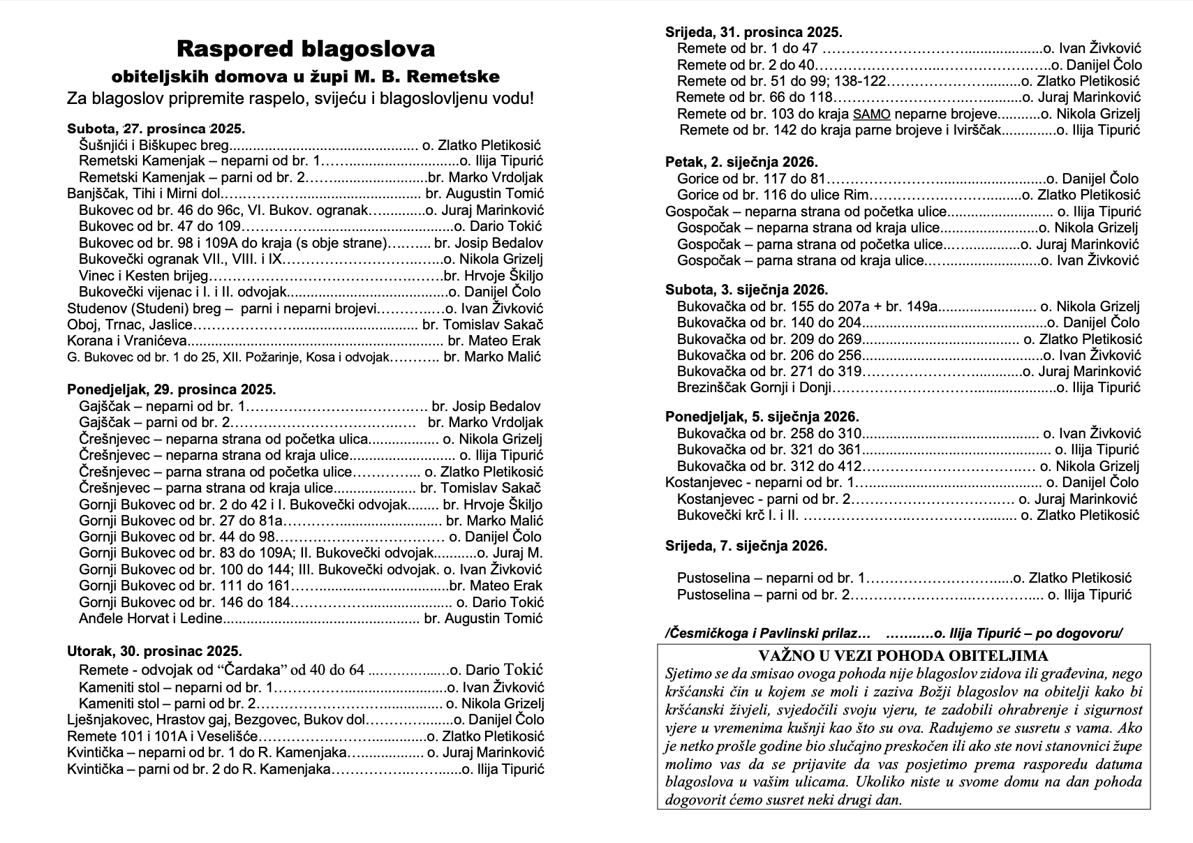 Raspored blagoslova obiteljskih domova u župi M. B. Remetske 2025./'26.